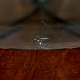 Tavolo Art Déco in legno impiallacciato con piano circolare in vetro, quattro montanti doppi e curvati, base circolare, cm h 77,5x129,5, (difetti)