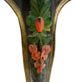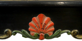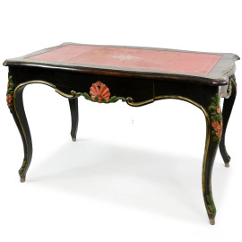 Tavolo in legno ebanizzato, fine XIX secolo, piano sagomato con inserto in pelle rossa, particolari floreali intagliati e laccati in policromia, quattro gambe mosse, cm h 78x122x88 (difetti)