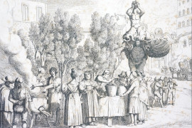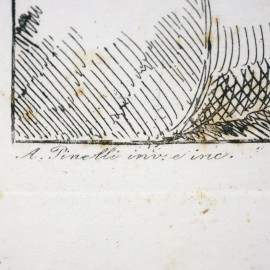 Tre stampe raffiguranti "I Frigitori a Piazza Barberina", "Veduta di Testaccio" e "La carità dei Frati", cm 43x52, inventore Bartolomeo Pinelli (1781-1835), entro cornici, (macchie)