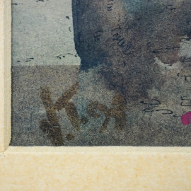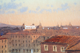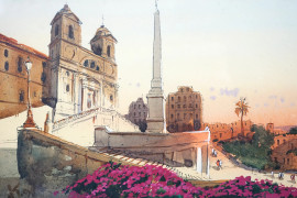 Trinità dei Monti al tramonto, acquarello su carta, cm 22,5x45 circa, XX secolo, entro cornice.