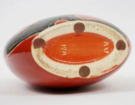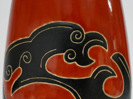 Vaso in maiolica smaltata color mattone con decori astratti, cm h 37,5, marcato sotto la base.