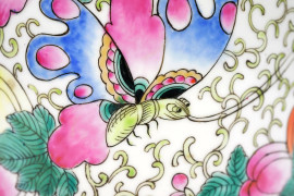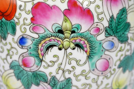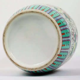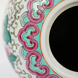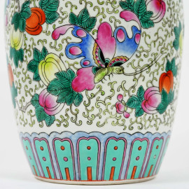 Vaso in porcellana policroma con decori di frutti e fiori, cm h 29, Cina, XX secolo.