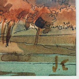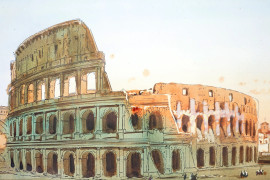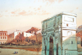 Veduta del Colosseo e dell' Arco di Costantino, acquarello su carta, cm 25x42, XX secolo, siglato, entro cornice.