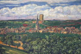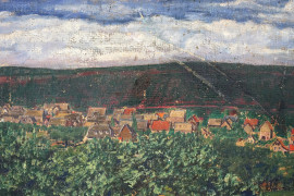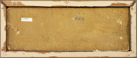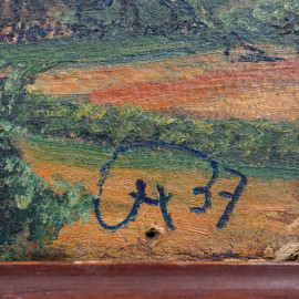 Veduta di paese, olio su tela applicata su cartone, cm 24,5 x 69,5, siglato e datato, entro cornice
