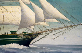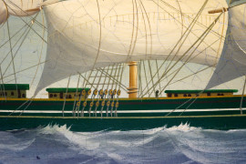 Veliero, olio su tavola, cm 40,5x89,5, firmato, entro cornice