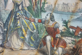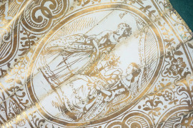 Ventaglio del XIX secolo, in carta lumeggiata in oro con litografia dipinta a mano raffigurante festa campestre, stecche in osso inciso e traforato, entro ventagliera, ingombro max cm 43x67,5