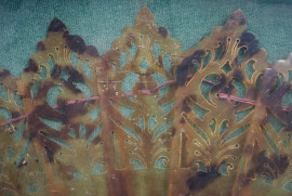 Ventaglio in finta tartaruga, con stecche traforate, entro ventagliera, ingombro max cm 29,5x44, (difetti)
