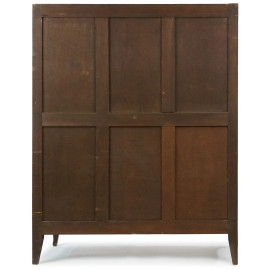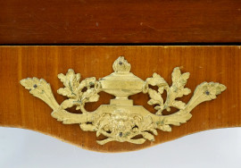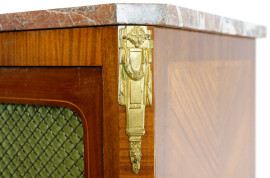 Vetrina in legno impiallacciato ed intarsiato, Francia, XX secolo, cm h 155x124x37, particolari in metallo dorato, quattro gambe mosse, (difetti)