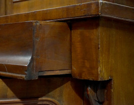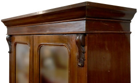 Vetrina in mogano, XX secolo, fronte con cornice aggettante modanata e due sportelli a vetri, parte inferiore ad un cassetto e due ante, particolari laterali scolpiti a motivi fogliacei, cm h 209x105x45, (difetti)