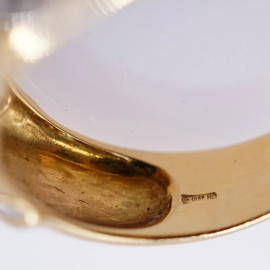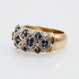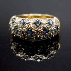 Anello in oro giallo 18 kt con zaffiri e diamanti, misure n. 15-16, peso gr. 8,2