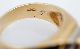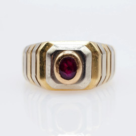 Anello in oro giallo e bianco 18 kt con rubino centrale, misura n. 18, peso gr. 13, (imperfezioni)