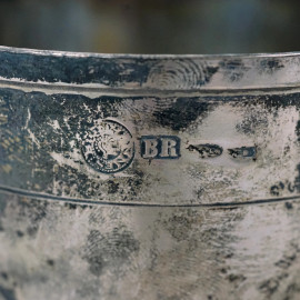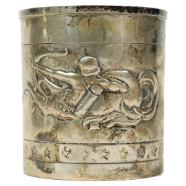 Bicchiere in argento sbalzato raffigurante sagittario, argentiere Brandimarte, XX secolo, cm h 9x8.4, peso gr. 125
