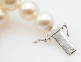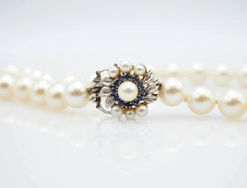 Collana di perle con chiusura in oro bianco 18 kt, lunghezza cm 59, peso gr. 68,6