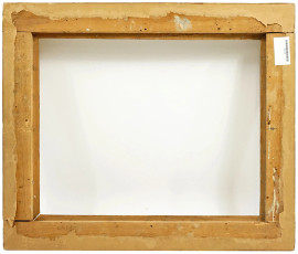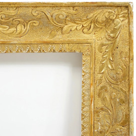 Cornice Carlo X in legno e stucco dorato decorata a motivi vegetali e a palmette, inizio XIX secolo, misure ingombro cm 60,7x51, misure battente cm 48,5x39 (difetti)
