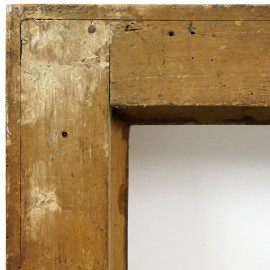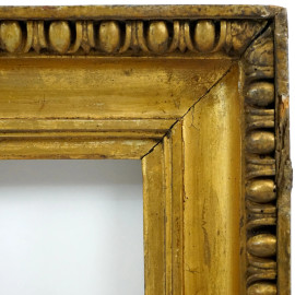 Cornice Impero in legno intagliato e dorato, XIX secolo, profilo interno modanato seguito da gola liscia che si porta a muro con battuta a ovoli, ingombro cm 62x53, battente cm 47x37,5