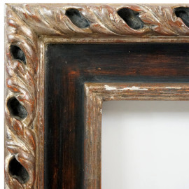 battuta interna modanata, seguita da fascia piatta nera che si porta a muro con battuta scolpita ad ampie foglie fermate ai centri da legatura a nastri incrociati