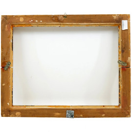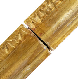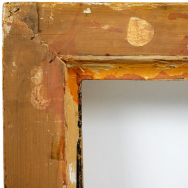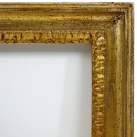 Cornice in legno dorato a mecca, XX secolo, profilo interno scolpito a foglie, ingombro cm 76x60, battente cm 64x49, (difetti)