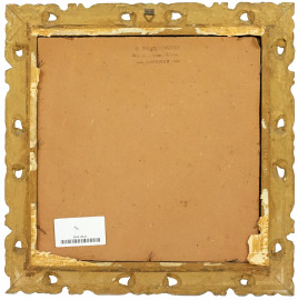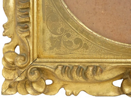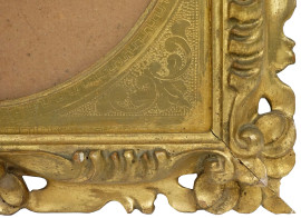 Cornice in legno dorato e inciso ed intagliato, fine XIX secolo, ingombro cm 33x33, battuta cm 25x25, (difetti)