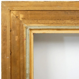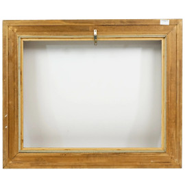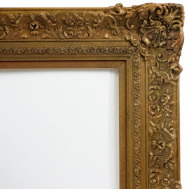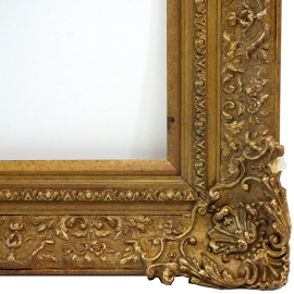 Cornice in legno dorato e stucco dorato, XX secolo, fascia riccamente decorata con motivi floreali a rilievo e cespi fogliacei agli angoli, ingombro cm 116x95, battente cm 92x71 (difetti)