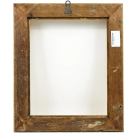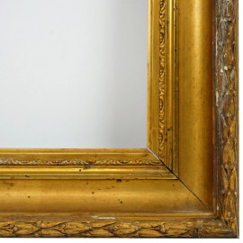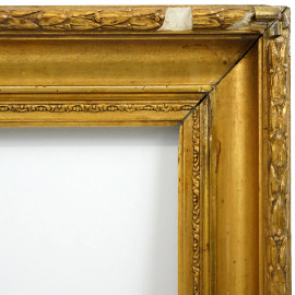 Cornice in legno dorato, XIX secolo, con battuta esterna a foglie ricorrenti, ingombro cm 47x40,5, battente cm 35,5x29 (difetti)