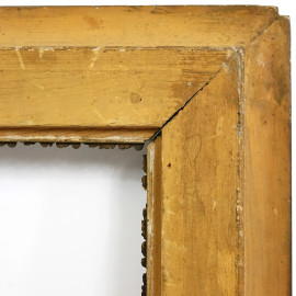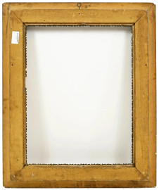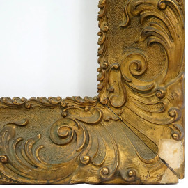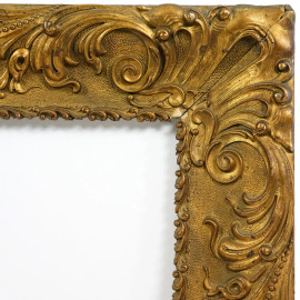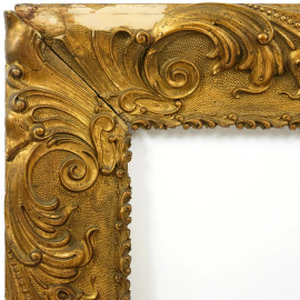 Cornice in legno e pastiglia dorata in stile Liberty, fascia decorata a volute e foglie d'acanto rilevate, ingombro cm 88x72, battuta cm 67x52, (difetti)