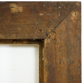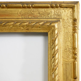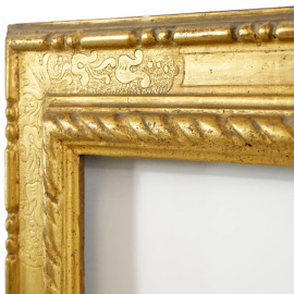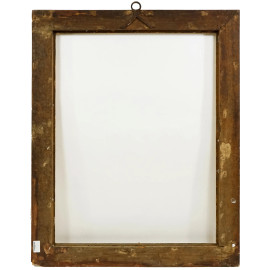 Cornice in legno intagliato e dorato con particolari incisi, XVIII secolo, ingombro cm 128x102, battente cm 107,5x81,5, (difetti)