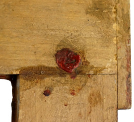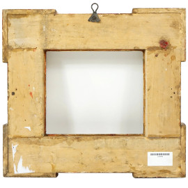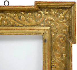 Cornice in stile rinascimentale, in legno e stucco dorato, fascia piatta recante motivo a tralci fogliacei bulinato, XX secolo, ingombro cm 38,5x42, battente cm 20x23,5