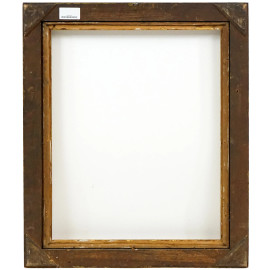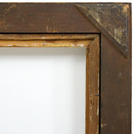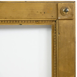 Cornice intagliata e dorata, XIX secolo, battuta interna liscia con profilo a ovoli, con fascia piatta e decori angolari, ingombro cm 74x63, battente cm 62x48, (difetti)