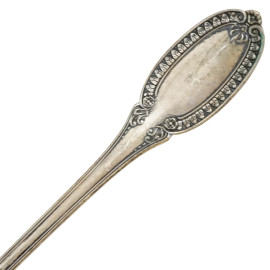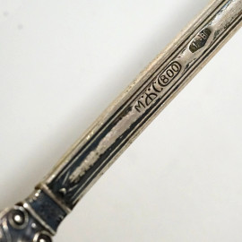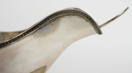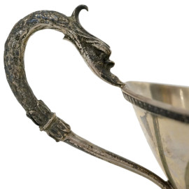 Salsiera in argento 800, XX secolo, con profili a foglie lanceolate e manico zoomorfo, completa di mestolo, cm h 12x22x12.5, peso gr. 550