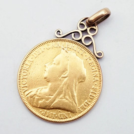 Sterlina in oro Vittoria-Testa Velata, 1893, con montatura a ciondolo, diametro cm 2, peso gr. 8,2