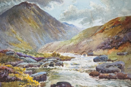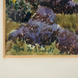 Alfred de Breanski (Greenwich, 1852 – Londra, 1926), Paesaggio montano con ruscello, acquerello su carta, firmato, cm 26x43, entro cornice