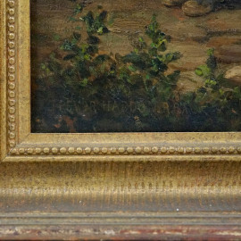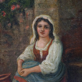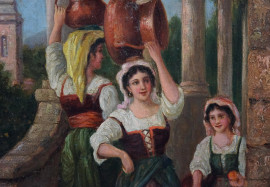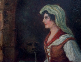 Alla fontana, olio su tela, firmato in basso a sinistra, XX secolo, cm 73,5 x 63,5, entro cornice