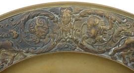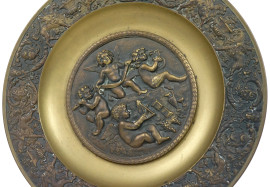 Alzata in bronzo dorato con piatto decorato a bassorilievo raffigurante dei putti suonatori, fascia esterna e base decorati a grottesche, XX secolo, h cm 15, diametro cm 26,1