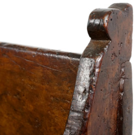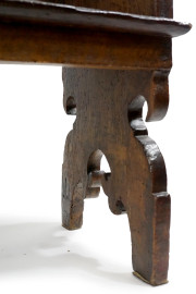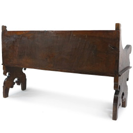 Antica panca da chiesa in noce, XVIII secolo, con braccioli e montanti sagomati, cm 95x148x45,5