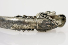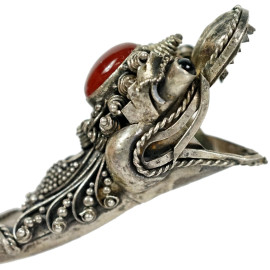 Bocchino per sigaretta in argento a forma di drago con decorazioni a filigrana e pietra cabochon, cm 8, peso gr. 7