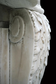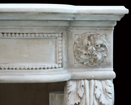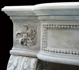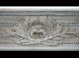 Camino in marmo bianco, XIX secolo, con piano superiore a bordo mistilineo, architrave scolpita a corona di alloro centrale entro riserva rettangolare perlinata e doppie riserve laterali a rosette. Montanti laterali mossi con apici a foglia d'acanto, piedi a mensola, cm h 115x165x34, (difetti)