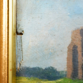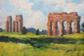 Campagna romana con acquedotto, olio su compensato, firmato, cm 16x22,5, entro cornice