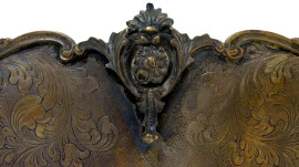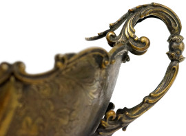 Centrotavola a navicella in argento 800, prima metà del XX secolo, bordo mistilineo, corpo baccellato con decori floreali incisi, due anse a volute fogliacee, h cm 17.5x45.5x20.5, peso gr. 1430, (difetti)