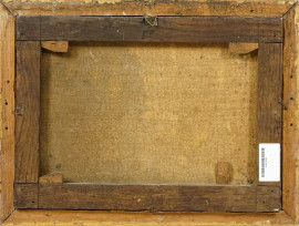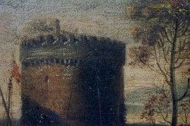 Cerchia di Adriaen van der Cabel (Rijswijk 1630 - Lione 1705), Paesaggio fluviale con ponte e viandanti, olio su tela, cm 29,4x40,7, entro cornice