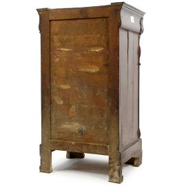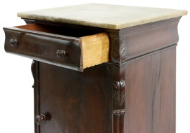 Comodino in piuma mogano, XIX secolo, con piano in marmo, fronte ad un cassetto ed uno sportello, piedi anteriori a mensola, particolari scolpiti, cm 90x50x40, (difetti)