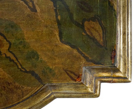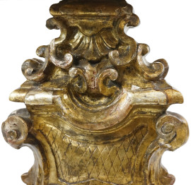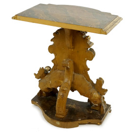 Consolle del XVIII secolo, in legno scolpito e dorato, piano mistilineo a finto marmo, sostegno intagliato a volute e controvolute con piedi leonini, base sagomata, cm 73x33,5x56, (elementi di epoche successive)