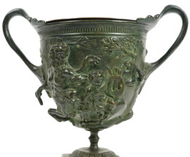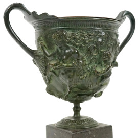 Coppa in bronzo "Grand Tour Kantharos" raffigurante centauri e putti con base in marmo nero, fine XIX secolo, h cm 14, totale h cm 22