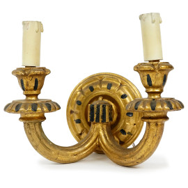 Coppia di applique a due luci in legno dorato con particolari ebanizzati, XX secolo, h cm 20 circa, (difetti)