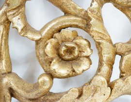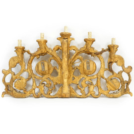 Coppia di appliques a cinque luci in legno scolpito e dorato, XX secolo, cm h 49x87
