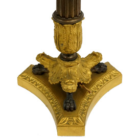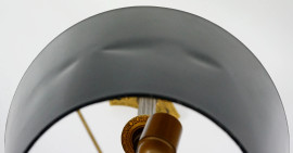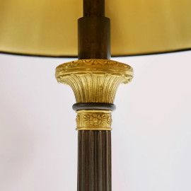Coppia di lampade in metallo dorato, paralumi in carta nera, XX secolo, cm h 94 circa, (difetti)