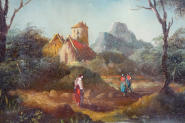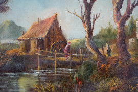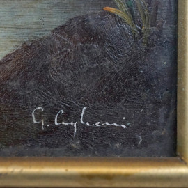 Coppia di miniature raffiguranti paesaggi, cm 17.5x12.5, firmate, entro cornici.