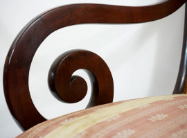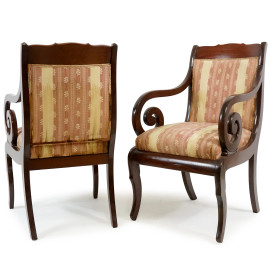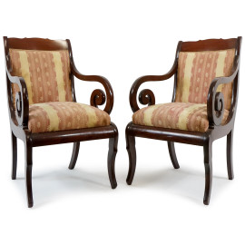 Coppia di poltrone in noce con braccioli a ricciolo, fine XIX secolo, gambe anteriori sagomate, le posteriori a sciabola, cm h 88, (segni del tempo)