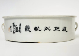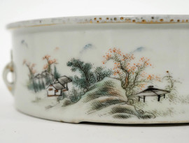 Coppia di portavivande in porcellana, Cina, XX secolo, decorate in policromia con paesaggi e iscrizioni, cm 6,5x21,(difetti)