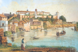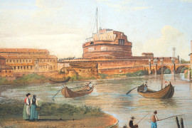 Coppia di vedute di Roma, tempera su carta, cm 22,5x34,5, metà del XIX secolo, entro cornici