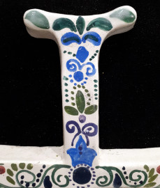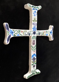 Croce in terracotta policroma con decoro bizantino dipinta a mano e smaltata, cm 30x23, montata su pannello in legno e velluto cm 48x45